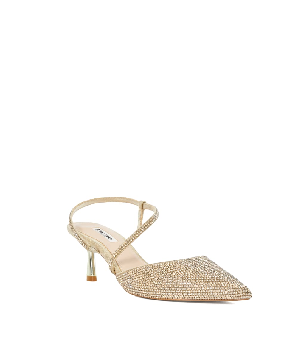 It's all in the details with our Competitive kitten heel slingbacks. Set on a flattering and comfortable mid height heel the upper of this silhouette features glimmering embellishments. Complete with an elegant asymmetric strap that crosses over the front of the foot, this elegant style will add a subtle shimmer to your occasion looks.