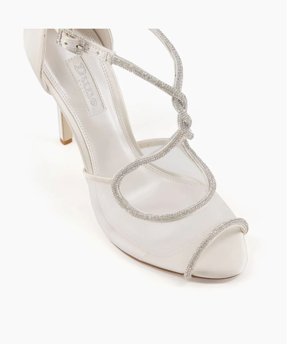 Designed for the modern bride our peep toe heels are embellished with seed beads and feature sheer mesh panels. The elegant silhouette is complemented by a slim, wearable high heel.